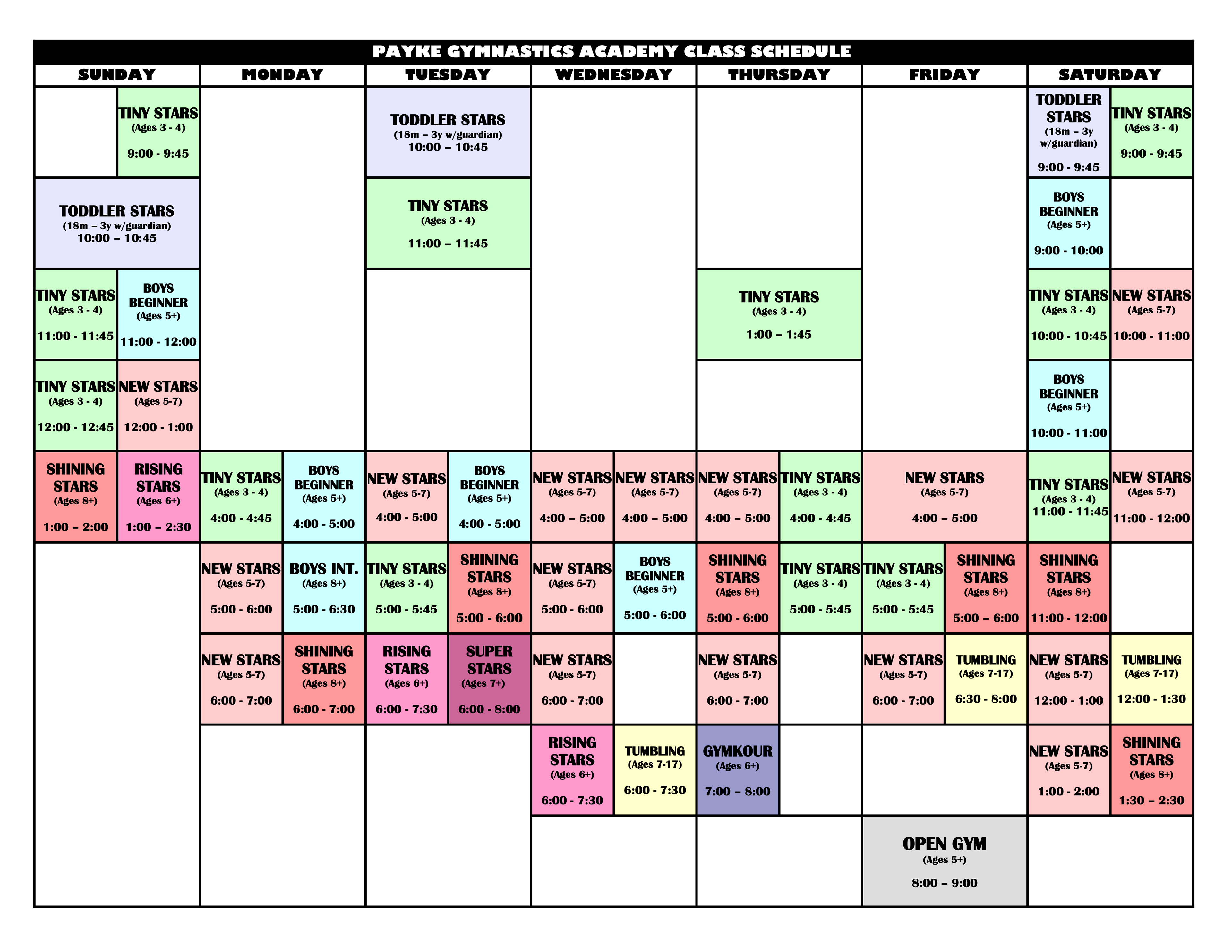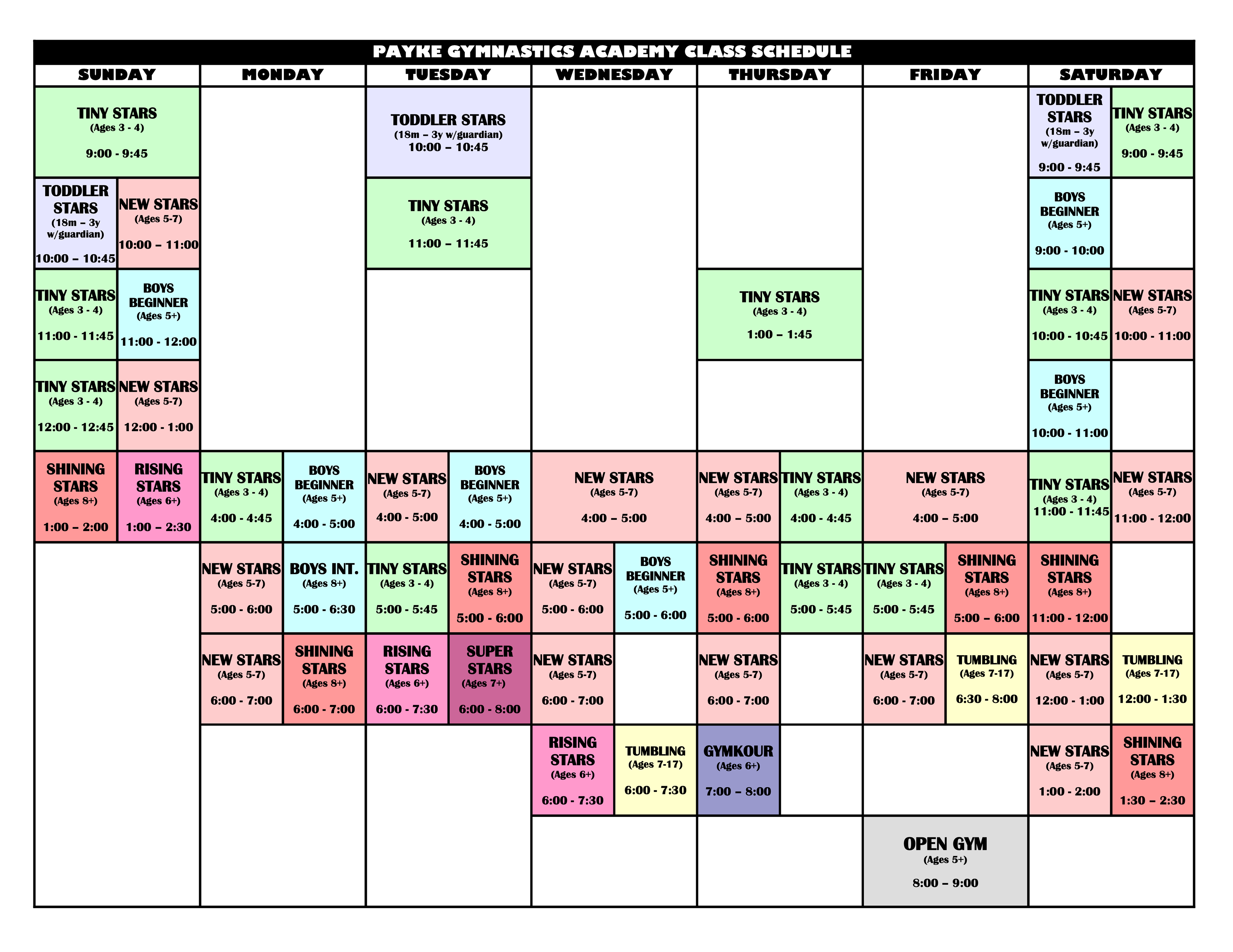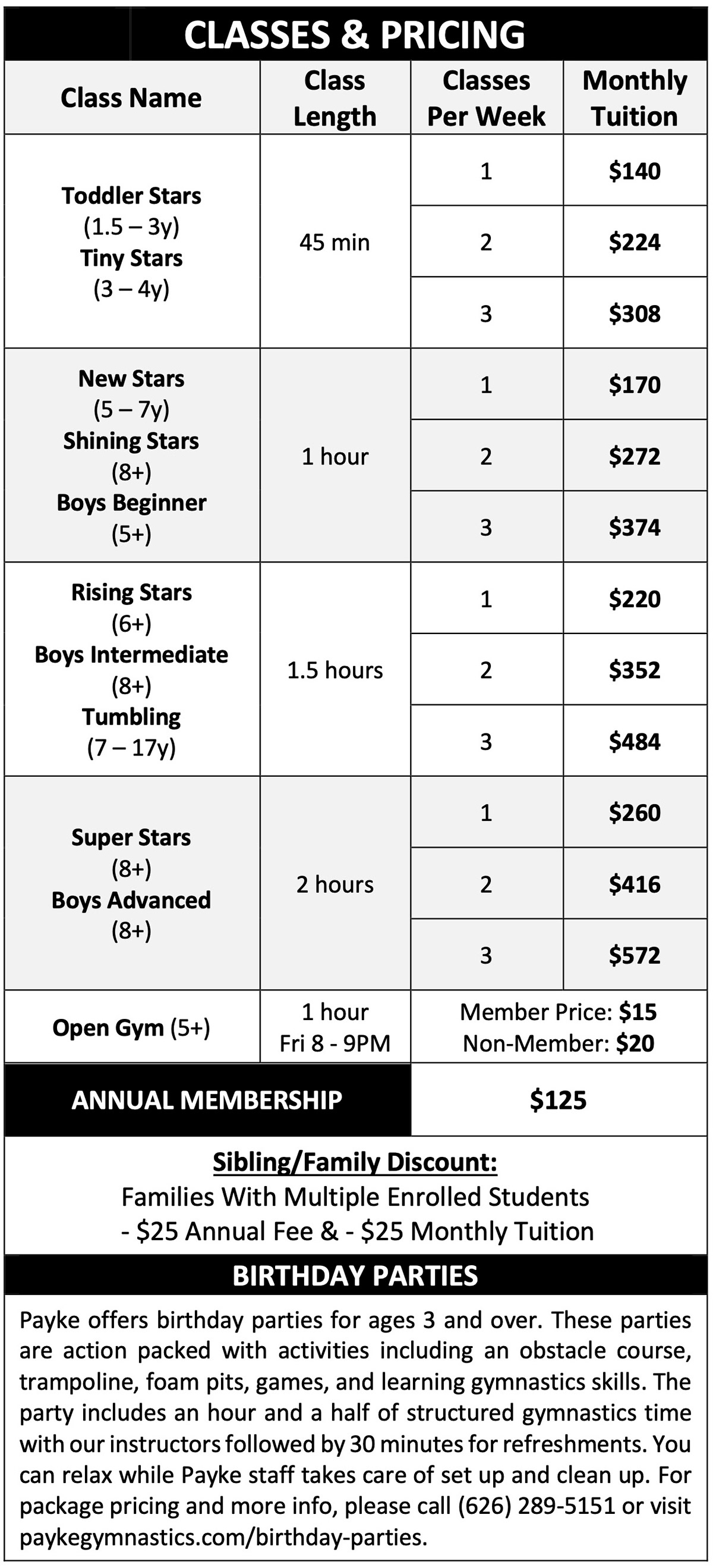 we offer recreational classes from 18 months through adult classes alongside boys + Girls competitive teams